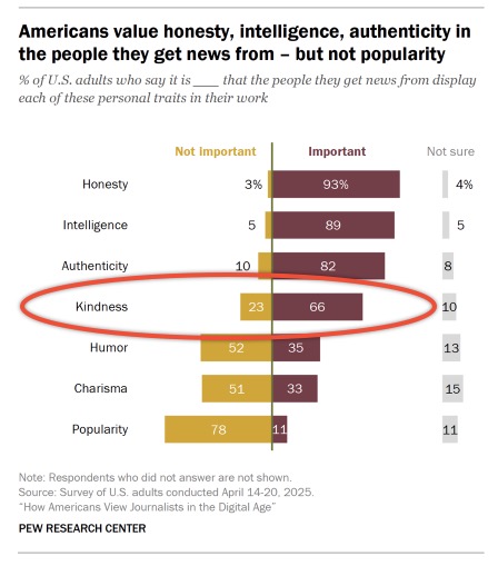One finding that seems underreported and undervalued from the 2024 Pew study of news consumers was how much they value kindness in journalists. Well over half of the 9000+ people surveyed — 66% — said it was very important.